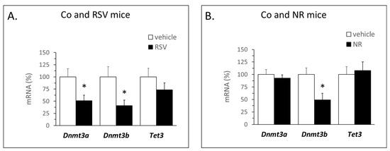 3.3. Early Life Supplementation with RSV or NR Affected the DNA Methylation Machinery in iWAT of Young Mice