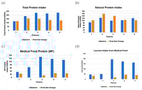Changes in intake for each patient from baseline to final diet change. The Recommended Dietary Allowance (RDA) for protein intake was calculated based on the Institute of Medicine guidelines [7]. (a) Total protein intake from baseline to final diet change, p = 0.035; (b) natural protein intake from baseline to final diet change, p= 0.204; (c) medical food intake from baseline to final diet change, p = 0.014; and (d) leucine intake from medical food from baseline to final diet change, p= 0.0276.