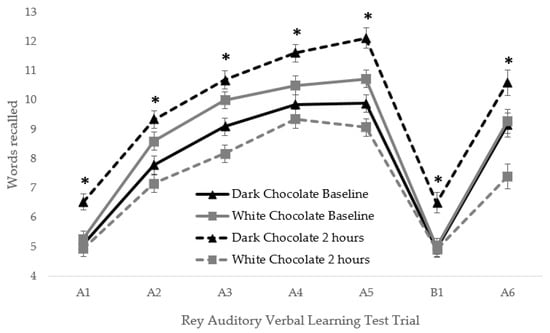 The findings indicate that the consumption of a standard 35 g 70% cocoa dark chocolate bar can benefit verbal episodic memory relative to an equicaloric 35 g white chocolate bar two hours post consumption in healthy young adults. Previously, acute cognitive benefits in healthy young and middle-aged adults following cocoa consumption have been seen for measures of executive function and processing speed [11,12,13], spatial memory [12], and working memory [14]. This is one of the first reported observations of improved verbal episodic memory two hours post cocoa consumption. The benefit was notable in that seventeen more words were recalled following DC relative to WC over the course of seven trials. In support of the validity of the present findings, the task used (RAVLT) has shown sensitivity to other acute flavonoid interventions, including blueberries (see [25] for a review) and the Haskap berry [26].