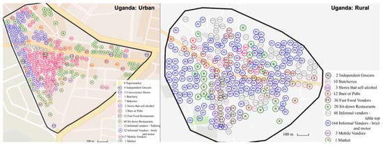 The primary site in Uganda was a 1.3 km2 area of Mayuge, a rural town council in eastern Uganda, with a population of 17,392 and population density of 437 per km2 (2017) []. Approximately 63% of households in the district are involved in fishing, which is the main source of income. The district which includes the primary site had a population of 473,239—of which, approximately two-thirds of adults are illiterate. Approximately 6% of the households in the selected site have less than 2 meals a day []. The matched urban site is part of Kampala’s central business district and observations covered an area spanning approximately 0.4 km2. Kampala district as a whole had a population of 1,507,080 and a population density of 8562 people per km2 []. The district has lower illiteracy levels among adults (5.6%) and the proportion of households living on less than one meal a day in Kampala Central is approximately 12%. Most households depend on informal employment for their livelihood. Using diabetes as a proxy for NCDs, Uganda has an overall low prevalence (1.6%); that hides a range of prevalence estimates, one as high as 16.1% in a rural area and an overall pre-diabetes prevalence of 16% [].