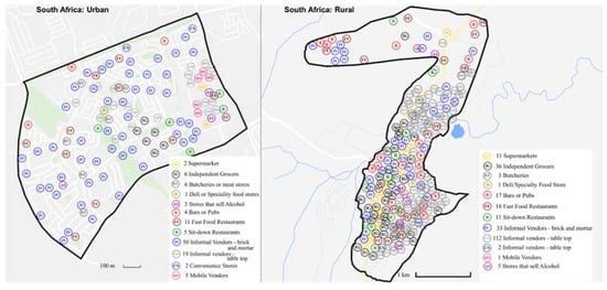 Results from the food environment assessments are described below according to the external food environment domains as outlined and defined in the ANH-FEWG food environment conceptual framework [], i.e., availability, price, vendor and product properties, as well as marketing and regulation. The main results showing between country comparisons are included in the text and additional details are presented in supplementary tables (Tables S1–S6). To avoid interpretation errors due to the small sample size, the highest and lowest counts are presented next to the means in each table. The variables are also presented by the different store types observed in the setting, by type of area (urban/rural) and as country totals. Additionally, for each site, an overview map was created to show the spread of food retail outlets (Figure 1, Figure 2 and Figure 3).