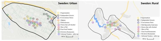 In the six selected sites, a total of 990 food retail outlets were identified during the overall mapping (excluding shops that sell alcohol) (Table 1). The most striking between-country differences relate to the overall number of outlets and food retail outlet type in the selected sites. Sweden had the fewest outlets of all three countries, with only 50 food retail outlets in total compared to 354 and 586 noted in South Africa and Uganda respectively. The spread of the food retail outlets is shown in Figure 1, Figure 2 and Figure 3 which have been resized to fit the text (not to scale). Maps to scale are available in Supplementary file S2, Figures S1–S6.