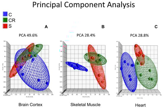 Principal component analysis of the whole transcriptome of old mice (C) (blue), old calorie restricted (CR) (green) and old supplemented with a calorie restriction mimetic micronutrient blend (S) (red) in brain cortex (Panel A), skeletal muscle (Panel B) and heart (Panel C). The percentage results of the sum of the three components (PC1, x-axis), PC2 (y-axis), and PC3 (z-axis) as indicated in the figure (% = PC1 + PC2 + PC3). The percentage of variability is 49.6% in brain cortex, 28.4% in skeletal muscle and 28.8% in heart.