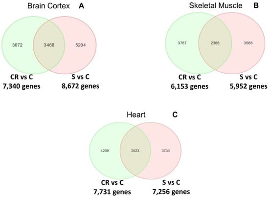 Venn diagrams of the differentially expressed genes that overlap between old calorie restricted (CR) vs. (C) and old supplemented with a calorie restriction mimetic (S) vs. old mice (C) in brain cortex (Panel A), skeletal muscle (Panel B) and heart (Panel C).