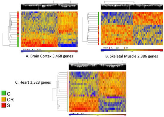 Unsupervised hierarchical clustering (heatmaps) of the differentially expressed genes of old mice (C), old calorie restricted (CR) and old supplemented with a calorie restriction mimetic (S) in brain cortex, skeletal muscle and heart. The number of the differentially expressed genes for each comparison is shown in Figure 2. Overexpressed genes are represented in red and underexpressed genes in blue. Each line represents a tissue sample and each column a gene.