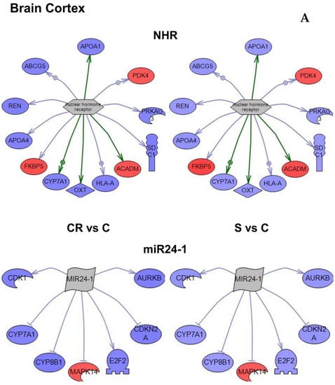 Based on the subnetwork analysis of the 3468 genes that were differentially regulated in CR or in animals supplemented with the CR mimetic when compared with old controls, the nuclear hormone receptor and MIR24-1 were identified as the most robust subnetworks in brain cortex (Figure 4A and Table 2).The subnetwork that had the greatest number of genes and the one with the highest p value were each selected (Table S4) since both approaches contribute to our understanding of the changes caused by either CR or the treatment with the CR mimetic.