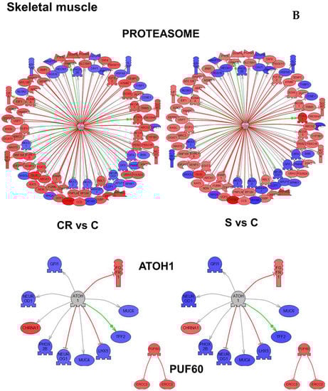 An important common feature can be observed in Figure 4 that genes within each subnetwork tend to change in the same direction in both CR and in animals supplemented with the CR mimetic (in blue underexpression and in red overexpression). The Tables S4–S6 show genes involved in each subnetwork, and the level of expression can be consulted in Tables S1–S3.