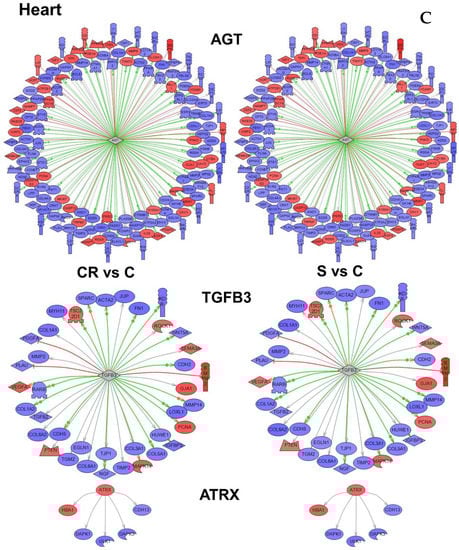 The relevant subnetworks identified by the subnetwork analysis for the 3523 genes differentially expressed in the heart are shown in the Supplementary Materials (Table S6). Figure 4C depicts the subnetworks for three genes. The first, angiotensinogen (AGT), had highest overlay in number and highest p value (Table S6)—a strong indication that angiotensinogen is an important gene in the functional regulation of the heart tissue. The second and third genes—ATRX (ATP-dependent helicase ATRX) and TGFB3 (Transforming growth factor beta-3)—were both selected based on higher p values.