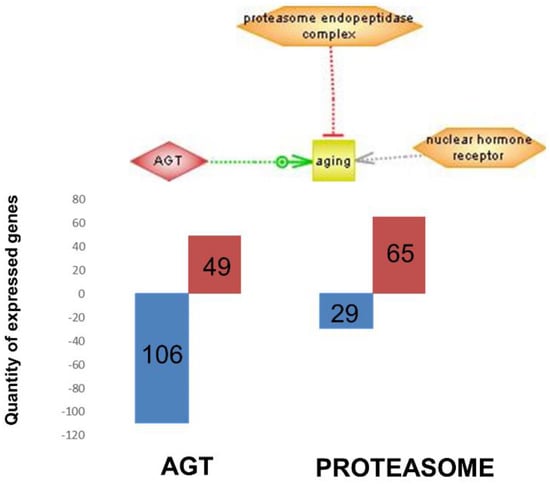 Representation of some of the most important regulators found (see Figure 4) that are related to aging and the total number of genes that are down or overexpressed in this subnetwork. Color of the arrow corresponds to the type of regulation of expression. Green is known positive regulation, red is known negative regulation and grey is a direct regulation, but unknown effect. Bar columns in blue are genes underexpressed and bar columns in red are genes overexpressed for angiotensinogen (AGT) and proteasome subnetworks.