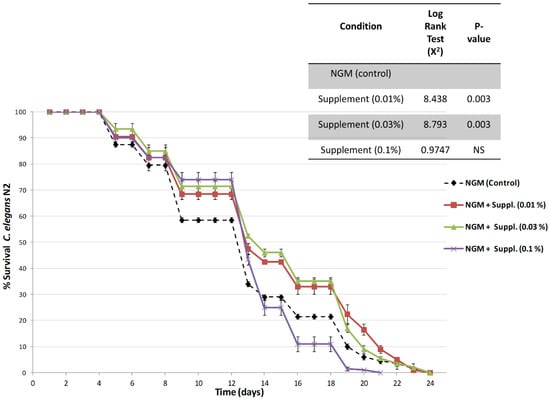 Survival curves (percentage of survival) obtained in C. elegans (N2) cultured in nematode culture plates (NGM) or in NGM with different doses of the supplement. Data are the average of two independent experiments.