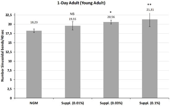 Mobility rate of C. elegans N2 young adults (1-Day) treated with the supplement at different doses. Number of body bends in 40 s measured in a total of 25 worms/condition/assay. ** Significant at p ≤ 0.01; * Significant at p ≤ 0.05; NS: Not significant vs. control NGM. Data are the average of two or three independent experiments.