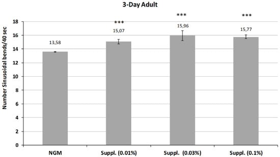 Mobility rate of C. elegans (N2) at 3-Day adult stage treated with the supplement at different doses. Number of body bends during 40 s measured in a total of 25 worms/condition/assay. *** Significant at p ≤ 0.001 vs. control NGM. Data are the average of two or three independent experiments.
