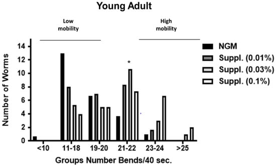 Distribution of mobility rate in Young adult (1-Day) worms used in the study. Different groups were established based on the speed (number of body bends/40 s) of worms. One-way ANOVA was used to compare conditions within each group for number of body bends. * Significant p < 0.05 vs. NGM (within the group).