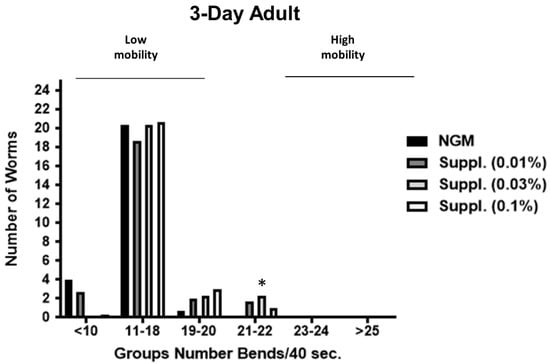 In the case of the 3-Day adults (Figure 10), the supplement at a dose of 0.1% again led to an increase in the number of worms with high mobility (group of 19–20 bends/40 s) and the dose of 0.03% increased the number of worms moving at 21–22 bends/40 s) (p < 0.05).