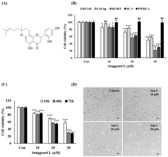 Sanggenol L is one of several components of root bark of M. alba (Figure 1A). DU145, LNCap, RC-58T, and PC-3 human prostate cancer cells were treated with or without 10, 20, and 30 µM sanggenol L for 48 h and then analyzed by performing SRB assays (Figure 1B). Saggenol L significantly inhibited the growth of RC-58T human prostate cancer cells as well as DU145, LNCap, and PC-3 human prostate cancer cells, whereas RWPE-1 human normal cells derived from prostate epithelial cells were unaffected by sanggenol L treatment. Moreover, sanggenol L induced time- and dose-dependent reductions of cell viability in RC-58T human prostate cancer cells (Figure 1C). Cell morphological changes were evaluated in RC-58T cells upon sanggenol L treatment by using phase-contrast microscopy (Figure 1D). After treatment with various concentrations of sanggenol L for 48 h, cell numbers decreased and cell adhesion was weakened in a dose-dependent manner. These results suggest that sanggenol L treatment can inhibit cell growth in various human prostate cancer cell lines.