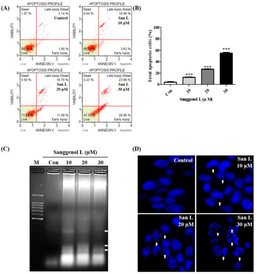 The RC-58T cells were seeded at a concentration of 5 × 104 cells/well and cultured for 24 h. After culturing, the cells were treated with sanggenol L (10, 20, and 30 µM) for 48 h. The cells were subsequently lysed with lysis buffer (10 mM Tris-HCl, pH 7.5, 10 mM EDTA, pH 8.0, 0.5% Triton X-100, 20% SDS, and 10 mg/mL of proteinase K) and then centrifuged (1200 rpm, 5 min). After extraction with phenol: chloroform: isoamyl alcohol (25:24:1), the obtained pellets were incubated with TE buffer (10 mM Tris-HCl, pH 7.4, 1 mM EDTA, pH 8.0) and RNase A (2 mg/mL, Sigma, St. Louis, MO, USA) for 1 h at 37 °C. Next, electrophoresis was performed on 2% agarose containing ethidium bromide. The DNA bands were measured using a UV Transilluminator Imaging System.