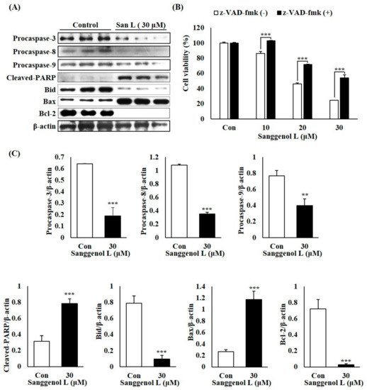Apoptosis is related to the regulation of caspase cascades, and caspases are known as effector (caspases-3, -6, -7) or initiator (extrinsic pathway; caspases-2, -8, -10, and intrinsic pathway; caspase-9) caspases. When caspases are activated, the procaspase levels decrease via the formation of cleaved-caspases [31]. Along with these caspase activities, apoptosis is also regulated by apoptosis-related proteins, also known as Bcl-2 family members, such as Bid, Bax, and Bcl-2, [32]. In this study, we showed that the levels of procaspases-3, -8, and -9, Bid, and Bcl-2 decreased and the levels of cleaved-PARP and Bax increased in prostate cancer RC-58T cells following sanggenol L treatment (Figure 3A,C). Moreover, the caspase inhibitor ‘z-VAD-fmk’ significantly inhibited the sanggenol L-induced cell death in RC-58T cells (Figure 3B). These results indicate that sanggenol L can induce apoptosis via a caspase -dependent pathway in primary prostate cancer RC-58T cells (Figure 3).