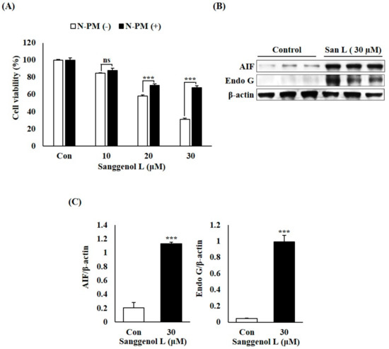 Apoptosis is associated not only with regulation of the caspase-dependent pathway but also with regulation of the caspase-independent pathway [24]. AIF and Endo G are representative caspase-independent pathway components and are released from mitochondria to the cytosol [24]. Several previous studies have shown that during apoptotic cell death, mitochondrial membrane permeabilization leads to the release of AIF and Endo G, the loss of mitochondrial function, and DNA degradation [11,22,33]. In this study, the levels of AIF and Endo G in prostate cancer RC-58T cells were increased by sanggenol L treatment (Figure 4B,C). Moreover, the AIF inhibitor ‘N-PM’ notably inhibited sanggenol L-induced apoptotic cell death in RC-58T cells (Figure 4A). These results indicate that sanggenol L can induce apoptosis in primary prostate cancer RC-58T cells through the caspase-independent pathway (Figure 4).