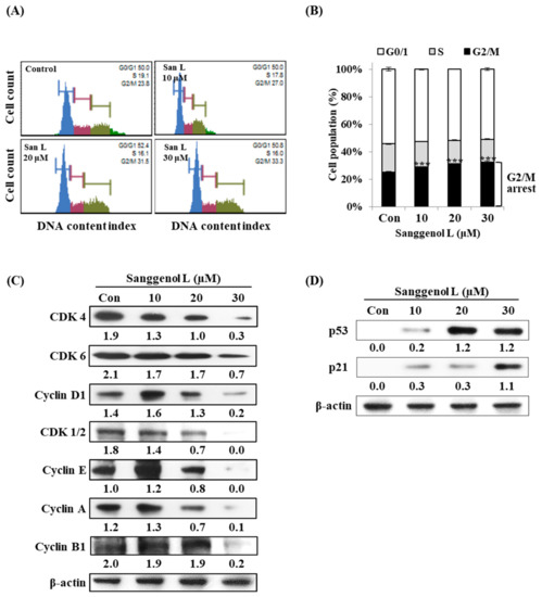 Cancer cells, without a normal cell cycle control process, continue to proliferate [28]. To further investigate whether sanggenol L induces cell cycle arrest in RC-58T prostate cancer cells, we examined the inhibition of cell cycle progression in RC-58T cells by sanggenol L treatment using the Muse™ cell cycle kit (Figure 5). As shown in Figure 2A,B, sanggenol L arrested RC-58T cells in the G2/M phase of the cell cycle. Compared to control cells, the G2/M phase in RC-58T cells was up-regulated by sanggenol L treatment in a dose-dependent manner, whereas G0/G1 and S phases of the cell cycle were unaffected by sanggenol L treatment (Figure 5A,B). Furthermore, we measured levels of cell cycle-related proteins in RC-58T cells following sanggenol L treatment (Figure 5C,D). Treatment with sanggenol L resulted in down-regulation of CDK1/2, CDK4, CDK6, cyclin D1, cyclin E, cyclin A, and cyclin B1, and up-regulation of p53 and p21 proteins in dose-dependent manners. These results demonstrate that sanggenol L can inhibit cell proliferation of RC-58T cells through cell cycle arrest, especially at the G2/M phase.