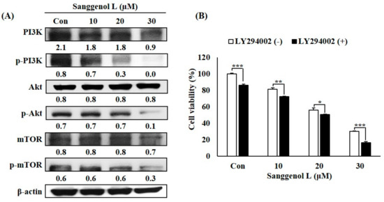 Phosphorylation of PI3K activates the phosphorylation of Akt and mTOR, which have central roles in the regulation of cell proliferation, growth, and survival [35]. Many previous studies have shown that natural substances have the ability to suppress the PI3K/Akt/mTOR signaling pathway in several cancer cells, thus, targeting the PI3K/Akt/mTOR signaling pathway is a key strategy for the suppression of cancer [36,37,38]. The levels of phospho-PI3K, phospho-Akt, and phospho-mTOR decreased in RC-58T cells following exposure to sanggenol L treatment (Figure 6A). Furthermore, pre-treatment of RC-58T cells with a PI3K inhibitor resulted in marked inhibition of cell proliferation compared to that in non-PI3K-inhibitor-treated cells (Figure 6B). These results suggest that the PI3K/Akt/mTOR signaling pathway is associated with the observed sanggenol L-induced cell growth inhibition in primary prostate cancer RC-58T cells (Figure 6).