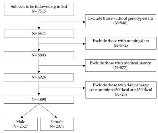 From a total of 7515 subjects, aged 43–74 years, we excluded 2617 subjects with missing data, those with daily energy consumption <500 kcal or >4500 kcal, those with previous history and presence of diabetes, renal disease, thyroid disease, cardiovascular disease, cancer, hysterectomy, and ovariectomy, and those who received medications for those diseases. Finally, 2527 male and 2371 female subjects were included in this study (Figure 1).