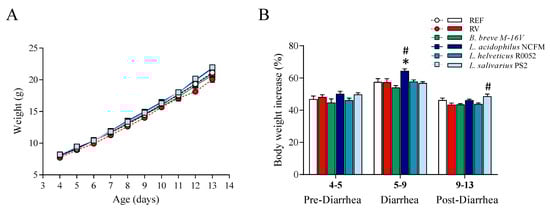 Assessment of animal growth. (A) Graph displaying the mean animal weight, which was measured daily from days 4 to 13 of life. (B) Graph displaying the body weight increase in the pre-diarrhea, diarrhea and post-diarrhea periods. Results are expressed as mean ± S.E.M. (n = 24/group). * p < 0.05 compared to the reference (REF) group; # p < 0.05 compared to the rotavirus-infected (RV) group. B.: Bifidobacterium; L.: Lactobacillus.