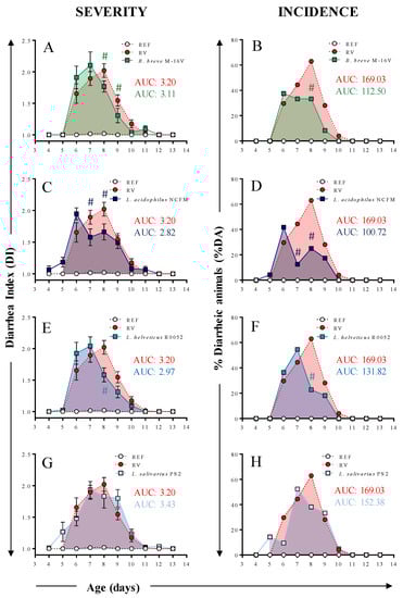 Clinical indices of diarrhea. Severity and incidence of diarrhea in animals receiving (A,B) B. breve M-16, (C,D) L. acidophilus NCFM, (E,F) L. helveticus R0052, and (G,H) L. salivarius PS2. The severity is expressed with the diarrhea index (DI) on a scale of 1 to 4. Scores of DI ≥ 2 indicate presence of diarrhea. The incidence of diarrhea is represented as the percentage of diarrheic animals (%DA), which corresponds to the percentage of animals displaying DI scores ≥ 2 in each group. The mean area under the curve (AUC) of severity and incidence, S-AUC and I-AUC, respectively, is represented with a colored shadow and its value is displayed in the right side of the graph. Results are expressed as mean ± S.E.M. (n = 4–21/group, depending on fecal sample availability). # p < 0.05 compared to the rotavirus (RV) group. REF: reference; B.: Bifidobacterium; L.: Lactobacillus.
