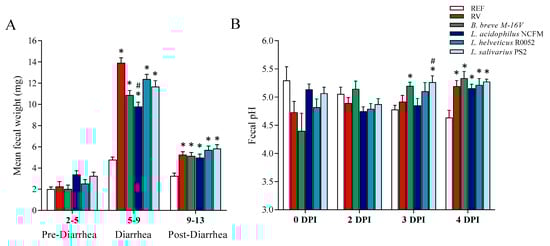Fecal variables. (A) Mean fecal weight during the pre-diarrhea, diarrhea, and post-diarrhea periods. (B) Fecal pH before the infection (0 days post-inoculation, DPI) and after the infection (2, 3, and 4 DPI). Results are expressed as mean ± S.E.M. (n = 4–21/group, depending on fecal sample availability). * p < 0.05 compared to the reference (REF) group; # p < 0.05 compared to the rotavirus (RV) group. B.: Bifidobacterium; L.: Lactobacillus.