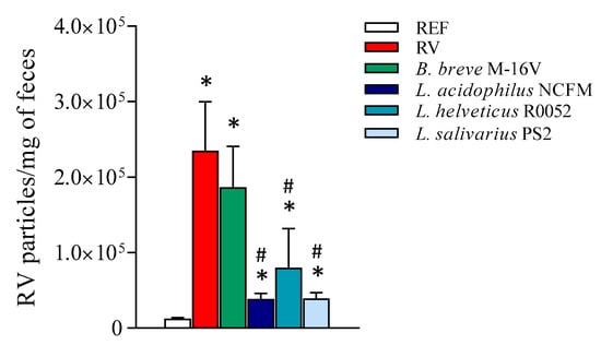 Fecal rotavirus elimination. The detection of rotavirus particles was performed in feces 1 DPI, which corresponded to the day of maximum elimination. Results are expressed as mean ± S.E.M. (n = 6–10/group, depending on fecal sample availability). * p < 0.05 compared to the reference (REF) group; # p < 0.05 compared to the rotavirus (RV) group. B.: Bifidobacterium; L.: Lactobacillus.