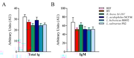 Specific anti-RV immunoglobulins (Ig). The quantification of anti-rotavirus (RV) Ig in plasma was performed by ELISA at the end of the study (day 14). The relative amount of (A) total and (B) IgM anti-RV Ig are displayed for the different experimental groups. Results are expressed as mean ± S.E.M. (n = 24/group) of arbitrary units (AUs). The highest dilution of the standard (pooled sera) corresponded to 1 AU. REF: reference; B.: Bifidobacterium; L.: Lactobacillus.