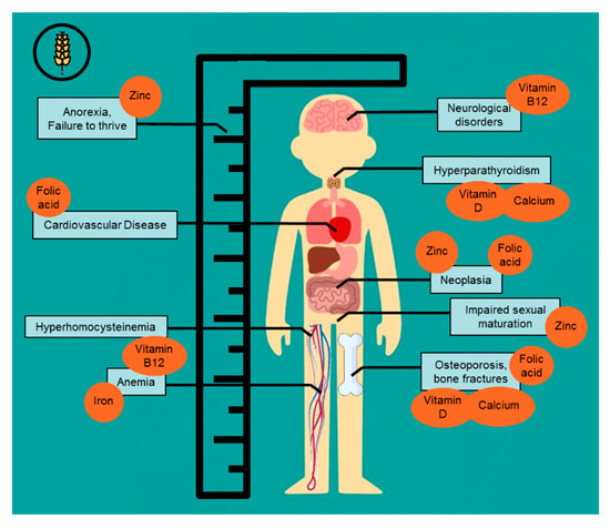 The functional absorptive surface of the intestine in CD is expected to restore after treatment with a GFD, thereby reestablishing nutrient absorption. However, studies reveal that full histological recovery requires long-term treatment, especially in adult patients. This makes CD patients prone to nutrient deficiencies in the first period after initiation of a GFD, even when strictly adhering to the diet [5,6,7,8]. Another complicating factor that may trigger development of deficiencies while treating the disease with a GFD is the diet itself. Withdrawing gluten-containing foods from the diet and substituting them with cereals that are less rich in nutrients may lead to a nutritional imbalance contributing to an overall impaired nutrient status [9,10,11]. Currently, it is unclear which types of nutrient deficiencies are frequently present in CD patients at diagnosis and during treatment with a GFD. Moreover, there is a lack of knowledge on the clinical relevance of nutrient deficiencies and hence the potential impact of nutrient supplementation on the clinical outcome in CD. To answer the main research question that forms the basis of this narrative review, we reviewed the published scientific evidence for nutrient deficiencies in pediatric and adult CD patients at diagnosis and during treatment with a GFD. Moreover, the review provides an appraisal of underlying causes of deficiencies and the clinical relevance of nutrient supplementation. Currently, the clinical impact of nutrient deficiencies and the effectiveness of their treatment are currently poorly defined. Besides, the assessment of nutrient deficiencies can be executed by different approaches, including measuring the values of individual nutrients in blood or urine, or by indirect evaluation of putative clinical consequences of deficiencies. Both of the latter approaches are addressed in this review. Finally, the review aims to evaluate whether the currently available evidence is of sufficient quality to provide recommendations for clinical practice.