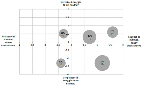 Two other smaller groups (namely, 2 and 4, make up a total of 24% of the respondents) are slightly opposed to nutrition policy interventions. On the one hand, cluster 2 includes respondents who struggle to eat healthily. On the other hand, cluster 4 comprises respondents who do not struggle to eat healthily.