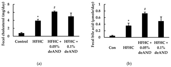 In this study, mice fed the HFHC increased (p < 0.05) fecal excretions of cholesterol and total bile acid contents than in those animals fed the low-fat control diet (Figure 4). deAND treatment was associated with increased (p < 0.05) fecal excretions of cholesterol and total bile acids. However, this cholesterol or bile acid-lowering effect of deAND was more significant in mice treated with 0.05% deAND than that of mice treated with 0.1% deAND treatment.