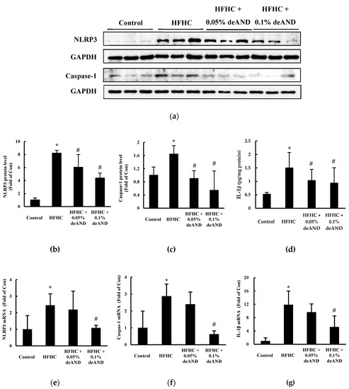 Western blotting analysis of NOD-like receptor protein 3 (NLRP3) and caspase-1 (P10) proteins in the liver (a). IL-1β protein level in liver was determined by a commercial kit as described in Material and Methods. The results show that deAND supplementation reduced the expressions of the proteins (n = 3 for figure b and c, and n = 6 for d) and mRNA (n = 6 for figure e–g) of NLRP3, caspase-1, and IL-1β in liver. The protein band was quantified by densitometry and mRNA expression level was calculated by the 2 -ΔΔCT method, respectively. * Significantly different from the Control group at p < 0.05. # Significantly different from the HFHC group, p < 0.05.
