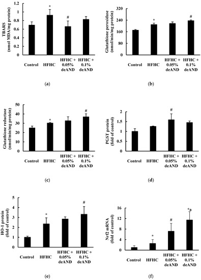 Effects of deAND supplementation on the hepatic TBARS content (a), GSH peroxidase activity (b), GSH reductase activity (c), pi form GSH-S-transferase (PGST) protein (d), HO-1 protein (e), and Nrf2 mRNA expression (f) in mice. Results are expressed as the mean ± S.D. (n = 6). * Significantly different from the Control group at p < 0.05. # Significantly different from HFHC group, p < 0.05. a Significantly different from the HFHC + 0.05% deAND group, p < 0.05.