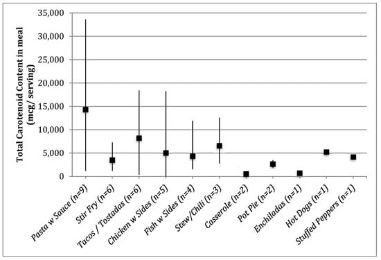 Scheme depicting means (as indicated by solid squares) and range (as indicated by solid lines) of carotenoid content per serving in prepared meals. () indicate the number of families that prepared a given category of dish.