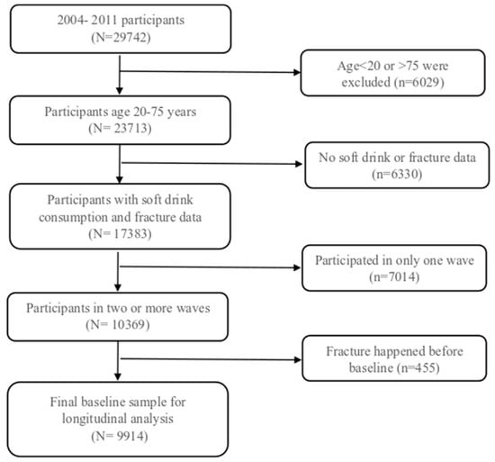 CHNS is an open prospective cohort study which was conducted in nine provinces in China [25]. Ten waves of surveys were conducted from 1989 to 2015. Participants may join or leave at any wave of the surveys. A multistage random-cluster sampling technique was used to select households in this study. All members of the selected families were invited to partake in the study. As the frequent consumption of soft drinks was assessed only in 2004, 2006, 2009 and 2011 surveys, the main analysis of the current study used data from the surveys between 2004 and 2011. Between 2004 and 2011, 29,742 participants joined the study at least once. After excluding participants who were not eligible (age below 20 or above 75 years (people with older age may suffer from chronic diseases which may be confounding factors of fracture), had no information of soft drinks (N = 6325) or fracture (N = 5)), a total of 17,383 participants were included in the analysis (Figure 1). In the longitudinal analysis of those without fracture at baseline, the sample size was 9914. This study was approved by the National Institute of Nutrition and Food Safety (Beijing, China) and the institutional review committees of the University of North Carolina (Chapel Hill, NC, USA). All the participants signed informed consent before the survey.