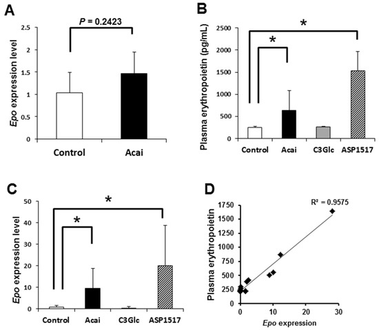 EPO is the principle regulator of red blood cell production [12]. In general, the Epo expression is transiently stimulated by a hypoxic condition [2]. After four days of administration of acai, the renal Epo expression showed a slight increase (Figure 1A). In this context, we performed a transient experiment, administering acai extract to mice and measuring the EPO contents in plasma 2–3 h after treatment. The acai treatment caused a significant increase in the plasma EPO level compared with vehicle control (Figure 1B). Furthermore, acai upregulated the Epo transcript level in the kidney compared with the control (Figure 1C). The erythropoiesis inducer roxadustat (ASP1517), which is also used to treat renal anemia, also upregulated both the EPO contents in plasma and the Epo transcript level in kidney (Figure 1B,C). In contrast to acai, the administration of C3Glc caused no significant change in either the EPO contents or the Epo level (Figure 1B,C). Furthermore, the relationship between the plasma EPO concentration and the kidney Epo transcript level was positive (Figure 1D). These results suggest that acai extract transcriptionally induced EPO production in the kidney.