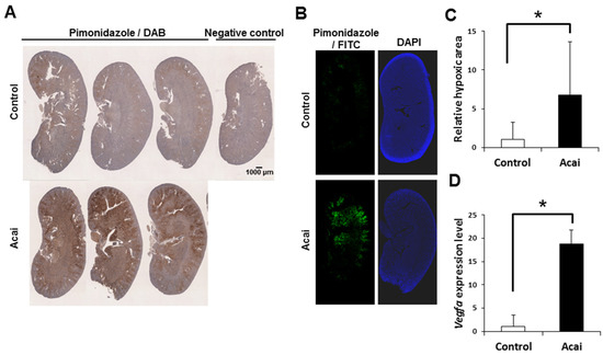 Finally, to investigate the relationship between EPO induction and renal hypoxia under acai administration, we administered the hypoxic probe pimonidazole to mice and histologically detected renal hypoxia. By immunostaining with pimonidazole, which accumulates in hypoxic areas, acai extract was shown to induce renal hypoxia (Figure 2A). A quantitative analysis with the fluorescence intensity of pimonidazole staining showed that acai created a significantly larger hypoxic area than was seen in the controls (Figure 2B,C). Furthermore, acai induced renal hypoxia mainly at the corticomedullary junction where erythropoietin is produced (Figure 2A,B). Along with hypoxia induction, acai also increased the expression of Vegfa, which located downstream of HIF, in the kidney (Figure 2D). These results suggest that renal erythropoietin production caused by acai depends on the hypoxic reaction in the kidney.