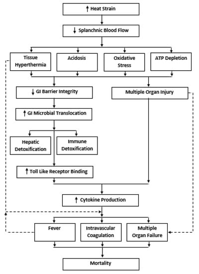 The GI EHS paradigm was first introduced as a novel pathophysiological concept in the early 1990s [41], before integration into conventional EHS medical classifications in 2002 [5]. The broad scientific basis of the GI EHS paradigm centers the notion that sustained exertional-heat strain initiates damage to the GI barrier, which consequently permits GI MT into the circulating blood. To counter this response, the liver’s reticuloendothelial system (RES) provides the first line of GI microbial detoxification (e.g., Kupffer cells and hepatocytes) through the portal circulation. However, the RES only confers a limited capacity for microbial neuralization before leakage into the systemic circulation arises [42]. Alternatively, GI MT can bypass the RES altogether, instead translocating directly through the mesenteric lymph nodes into the systemic circulation [43]. In the systemic circulation, MT products are neutralized through multiple host-binding pathways, which include: natural antibodies (e.g., immunoglobin G and M), leukocyte granular proteins (e.g., bactericidal permeability increasing protein, lactoferrin, lysozyme) and high-density lipoproteins [42]. In EHS patients, microbial detoxification capabilities are likely reduced, predominately due to the combined effects of RES dysfunction at Tcore above ~41–42 °C [44] and immune antibody suppression following strenuous exercise [45]. Failure of GI microbial detoxification mechanisms permits binding of unique GI pathogen associated-molecular patterns (PAMP) to toll-like receptors (TLR) located on cell surface membranes [46]. TLR activation initiates a cascade of intracellular events (e.g., nuclear factor kappa-light-chain-enhancer of activated B cells) that initiate the production of pro-inflammatory cytokines (e.g., interleukin [IL] 1-β, IL-2, IL-6, IL-8, tumor-necrosis factor [TNF]-α), which are counter regulated by the production of anti-inflammatory cytokines (e.g., IL-1ra, IL-4, sIL-6r, IL-10, sTNFr). Downstream of this systemic inflammatory response syndrome (SIRS), a complex interplay of responses that potentially culminates in hemorrhagic shock, disseminated intravascular coagulation (DIC), multiple organ failure (MOF) and possibly death [47]. The GI EHS paradigm is considered to be the primary cause of EHS in cases where Tcore remains below the threshold (~42–44 °C) of heat cytotoxicity [48]. A simplified schematic of the GI EHS paradigm is shown in Figure 1. Interested readers are referred to several detailed reviews on this topic [1,36,37].