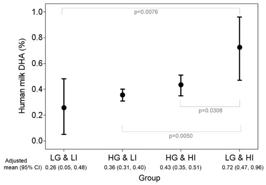 Stratified analysis by groups of genetic risk and total DHA intake statuses. Adjusted means and their 95% CIs of human milk DHA were obtained from the multiple linear regression model with consideration of age, body mass index , parity, and duration of pregnancy. LG: low genetic risk (minor allele number = 3 in rs1535 and rs174448); HG: high genetic risk (minor allele number ≤ 2 in rs1535 and rs174448); LI: low DHA intake (< 200 mg/d); HI: high DHA intake (≥ 200 mg/d).