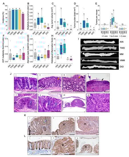 - Newmark, H.L.; Yang, K.; Lipkin, M.; Kopelovich, L.; Liu, Y.; Fan, K.; Shinozaki, H. A Western-style diet induces benign and malignant neoplasms in the colon of normal C57Bl/6 mice. Carcinogenesis 2001, 22, 1871–1875. [Google Scholar] [CrossRef][Green Version]