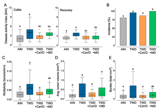 Restoration of calcium and vitamin D to amounts in the AIN diet suppressed colitis symptoms and inflammation-associated colon tumorigenesis in C57BL/6J male mice fed TWD (Experiment B). Diet groups included the standard AIN93G diet (AIN), the total Western diet (TWD), the TWD with calcium and vitamin D restored to AIN amounts (TWD + CaVD) or the TWD with methyl donor micronutrients B2, B6, B12, folate, and choline restored to AIN amounts (TWD + MD). (A) Colitis disease activity index (DAI) score (n = 29 to 32) at colitis and recovery time points. (B–E) Colon tumor outcomes include incidence (B), tumor multiplicity (C), average tumor volume per mouse (D), and burden as total tumor volume (E) (n = 23 to 26). Data in all panels (except B) are shown as Tukey box plots (box, 25th to 75th percentiles; whiskers, 1.5 IQR; +, mean). Different letters indicate that treatment groups are significantly different (p < 0.05) as determined by the appropriate linear mixed model or nonparametric test as outlined in the Materials and Methods.