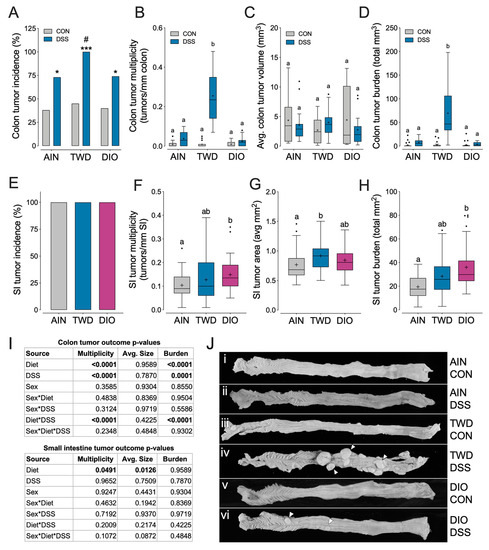 TWD promotes inflammation-associated colon tumorigenesis in ApcMin/+ mice, but does not markedly alter small intestine tumor development (Experiment C). ApcMin/+ female and male mice were fed a standard diet (AIN), the total Western diet (TWD) or the 45% fat diet-induced obesity diet (DIO) for 12 weeks. Half the mice were provided 1% DSS via drinking water for two weeks. (A) Incidence of colon tumors shown as the percent of mice with tumors. * p < 0.05, *** p < 0.001 for comparisons of DSS to CON group within each diet and # p < 0.05 for comparison across diet groups within CON or DSS cohorts as determined by the Chi-square test. (B–D) Data shown include colon tumor multiplicity (B), average size of colon tumors (as volume) (C) and colon tumor burden (as total volume) (D). (E) Incidence of small intestine tumors shown as the percent of mice with tumors. (F–H) Data shown indicate small intestine (SI) tumorigenesis endpoints for diet and DSS treatment, including SI tumor multiplicity (F), average size of SI tumors (as area) (G), and burden of SI tumors (as total area) (H). Data in B–D and F–H are shown as Tukey box plots (box, 25th to 75th percentiles; whiskers, 1.5 IQR; +, mean) (n = 18 to 22). Different letters indicate that groups are significantly different (p < 0.05) as determined by the appropriate linear mixed model or nonparametric test. For SI tumor outcomes, comparisons were made by diet group only as no main effect of or interaction with DSS was observed. (I) Main effect p-values for diet, DSS treatment, sex and all possible interactions are indicated to the right of charts for colon tumor data (top) or SI data (bottom). (J) Gross pathology images depicting colon tissues representative of each diet treatment group as follows: i, AIN and no DSS; ii, AIN+DSS; iii, TWD and no DSS; iv, TWD+DSS; v, DIO and no DSS; vi, DIO+DSS. White arrows indicate large colon tumors easily visible via low magnification light microscopy.