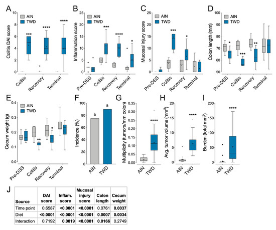 Consumption of TWD enhanced symptoms of colitis, colon inflammation and mucosa injury while also delaying recovery from gut injury caused by 1% DSS treatment (Experiment D). C57BL6/J male mice were fed AIN or TWD diets and provided DSS for 10 days to trigger colon inflammation. (A) DAI score (n = 8 at colitis and recovery, n = 20-23 at terminal time point). (B,C) Histopathology inflammation score (B) or mucosal injury score (n = 6 to 9). (D,E) Colon length (D) and cecum weight (E) (n = 7-8 for pre-DSS, colitis and recovery; n = 20-23 at terminal time point). (F–I) Colon tumorigenesis outcomes, including incidence (F), multiplicity (G), average tumor volume per mouse (H) and burden as the total tumor volume (I). Data in all panels (except F) are shown as Tukey box plots (box, 25th to 75th percentiles; whiskers, 1.5 IQR; +, mean). * p < 0.05; ** p < 0.01; *** p < 0.001; **** p < 0.0001 for TWD compared to AIN diet as determined by linear mixed model analyses for diet by time point with LS Means Student’s t-test post-hoc test between AIN and TWD diet groups. (J) Main effect p-values for diet, DSS treatment, sex and all possible interactions are shown for DAI score, inflammation score, mucosal injury score, colon length and cecum weight.