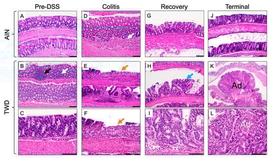 Histology of colonic tissues during the course of disease development. Representative images depicting H&E staining of colon tissues in mice fed AIN or TWD diets obtained prior to DSS treatment (A–C), during active colitis (D–F), during recovery from gut injury (G–I) and at the study end (J–L). Descriptions of tissue histology and image magnification: (A) normal colon (200×); (B) normal colon with occasional mild multifocal lymphocytic inflammation (white arrow) and gut-associated lymphoid tissue (black arrow) (200×); (C) normal colon (200×); (D) neutrophilic and lymphoplasmacytic colitis with inflammation in the mucosa and submucosa (white arrow) (400×); (E,F) neutrophilic and lymphoplasmacytic colitis with inflammation of the mucosa and submucosa (white arrow), mucosal ulceration (orange arrow), and loss of glands (E, 200×; F, 400×); (G) colon with mild lymphoplasmacytic and neutrophilic mucosal inflammation (200×); (H,I) Gastrointestinal intraepithelial neoplasia (blue arrow) (H, 100x; I, 400×); (J) normal colonic mucosa (200×); (K) colon adenoma (A) at low magnification (40×); and (L) colon adenoma (Ad) at high magnification (400×). Scale bar = 100 μm.