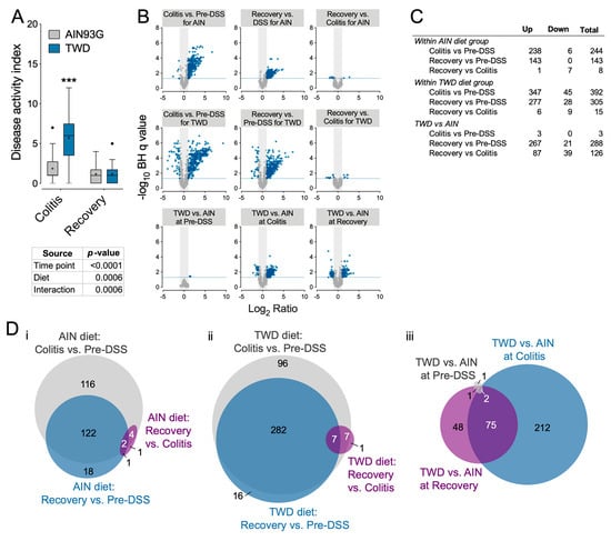 Expression of immune and cancer pathway genes in colon tissues was impacted to a greater extent in mice fed TWD as compared to those fed AIN during colitis and recovery (Experiment E). (A) Disease activity index (DAI) for mice fed AIN or TWD and given DSS to induce gut inflammation at colitis and recovery time points. (B) Volcano plots depicting immune-related mRNA expression as measured using the NanoString Mouse PanCancer Immune panel. Values shown are log2 ratios for each comparison indicated plotted against the -log10 of the Benjamini–Hochberg FDR q value. A significant difference in gene expression was inferred for genes with BH q value < 0.05 and log2 ratio > 1 or < −1. (C) Number of significant differentially expressed genes across time points within each diet or comparing AIN vs. TWD at each time point. (D) Proportional Venn diagrams depicting the number of genes identified as differentially expressed in colon tissues of mice fed either AIN or TWD diets. Comparisons were made by time point for AIN diet (i), by time point for TWD diet (ii), or by diet at each time point (iii).