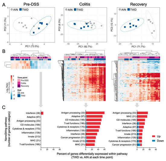 Exposure to the TWD prior to, during and after DSS-induced gut injury intensified changes in expression of genes associated with immune and cancer pathways as compared to mice fed AIN (Experiment E). (A) Principal components analyses (PCA) of differentially expressed genes (BH q < 0.05, log2 ratio > 1 or < −1) in colon tissues of mice fed either AIN or TWD prior to DSS (Pre-DSS), during active colitis (Colitis), or two weeks later during recovery (Recovery). PC1 and PC2 are shown with the 95% prediction ellipse. Because only three genes met all significance criteria at the Pre-DSS time point, all genes differently expressed by at least two-fold with an FDR p < 0.10 were used for the PCA analysis for that time point only. (B) Unsupervised, bidirectional hierarchical cluster analysis of colon transcriptome data using the Euclidean distance method with average linkage. For each time point, the heatmap shows all genes differentially expressed between TWD and AIN diet groups colored by the log2 ratio calculated with respect to AIN/Pre-DSS. (C) Bar charts indicate the number of genes differentially expressed at each time point for selected immune and cancer pathways. The total number of genes affiliated with each pathway for the PanCancer Immune panel are indicated in parentheses.