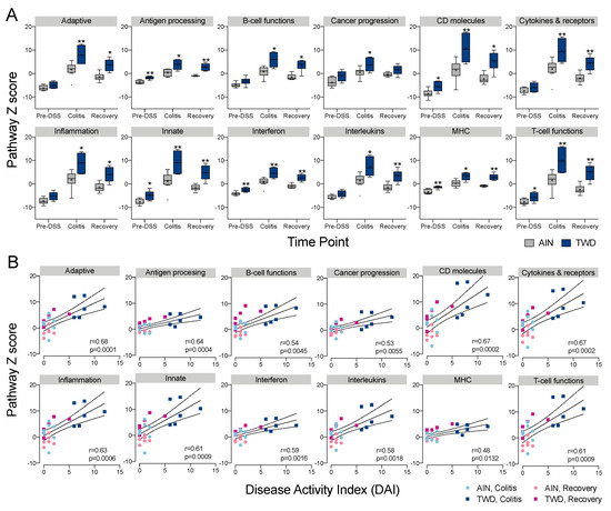 Pathway Z scores indicate broad scale changes in transcript abundance for genes associated multiple immune and cancer pathways that are also highly correlated with the colitis DAI. (A) Colon tissue gene expression pathway Z scores at Pre-DSS, colitis and recovery time points for mice fed AIN or TWD diets. Scores are shown as Tukey box plots (n = 6 to 8) for selected immune and cancer pathways. * p < 0.05 and ** p < 0.01 compared to time point-matched AIN control as determined by the non-parametric Steel-Dwass test. (B) Correlation analyses of immune-associated pathways and colitis disease activity index (DAI) at colitis and recovery time points. Spearman correlation r and p values are indicated.