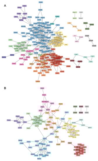 (prior page) Network visualization of significant differentially expressed immune response genes in colon tissues of mice fed TWD as compared to their AIN counterparts at colitis (A) or recovery (B). Network of DEGs in mice fed TWD Network interactions were modeled using the STRING database (string-db.org) with a minimum required interaction score ≥0.9, and clusters were identified using the Markov Cluster (MCL) algorithm with inflation parameter of 1.5. The network was visualized in Cytoscape. Major groupings include transcripts associated with cellular response to cytokine-mediated cell signaling and the STAT cascade (blue), antigen processing (yellow), cellular protein catabolic processes (red), regulation of granulocyte chemotaxis (green and purple).
